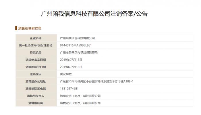 债权人公告信息显示,2019年07月18日,广州陪我信息科技有限公司因决议解散,拟向公司/农民专业合作社登记机关申请注销登记,请债权人自公告之日起45日内向清算组申报债权。债权人为陪我欢乐(北京)科技有限公司。