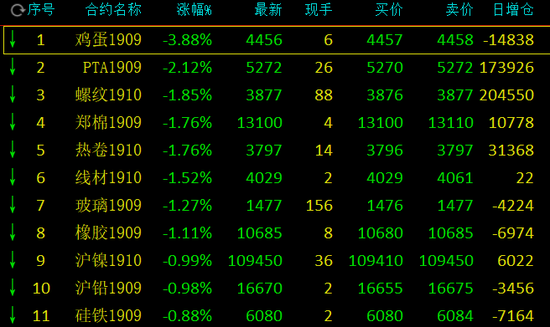 新浪财经讯 7月29日消息,午后商品期货持续早盘行情,全天跌多涨少,农产品分化,鸡蛋期货主力合约大跌近4%,郑棉跌近2%,白糖涨近2%;能化板块涨跌互现,乙二醇涨逾2%,PTA跌逾2%;黑色系进一步下跌,螺纹、热卷跌近2%;有色金属弱势,沪锌上涨,沪镍、沪铅走跌。