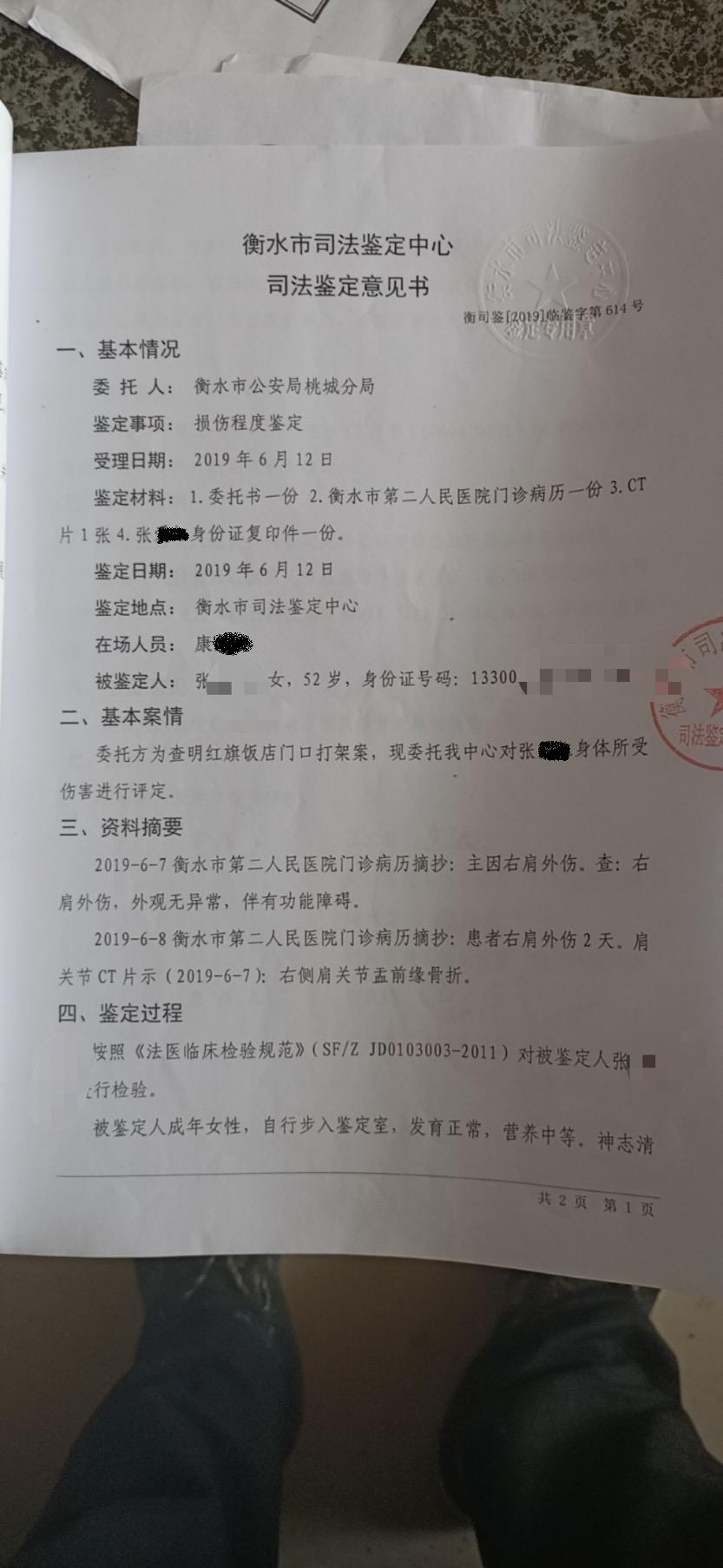 张某红还提供了一份司法鉴定意见书,其中写明,衡水市公安局桃城分局委托衡水市司法鉴定中心对张某红的损伤程度进行鉴定。结果显示,张某红右侧肩关节盂前缘小块状骨折,评定为轻微伤。