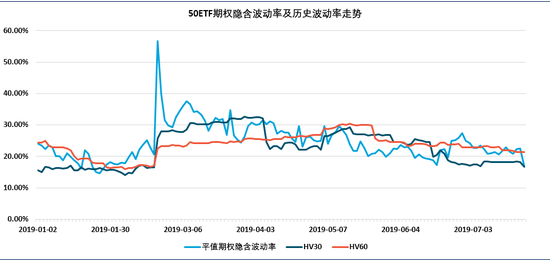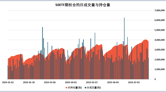 持仓量方面,50ETF期权的持仓量在2019年7月18日曾创出历史新高的404.88万张,但整个7月的日均成交量则在240万张左右,明显低于今年2月和3月的水平。