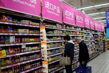顾客在上海某超市的进口产品区选购商品。(路透社)
