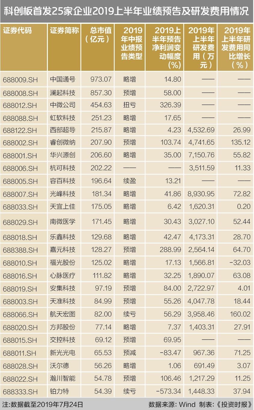 截至7月24日,首批科创板上市企业中,已有24家企业发布业绩预告,整体来看,实现净利润增长的企业高达21家。其中,中国通号的盈利能力最强,预计2019年上半年实现营业收入约204.6亿—219.7亿元,同比增长8.2%—16.2%;预计实现归母净利润21.1亿—22.8亿元,同比增长6.3%—14.8%。