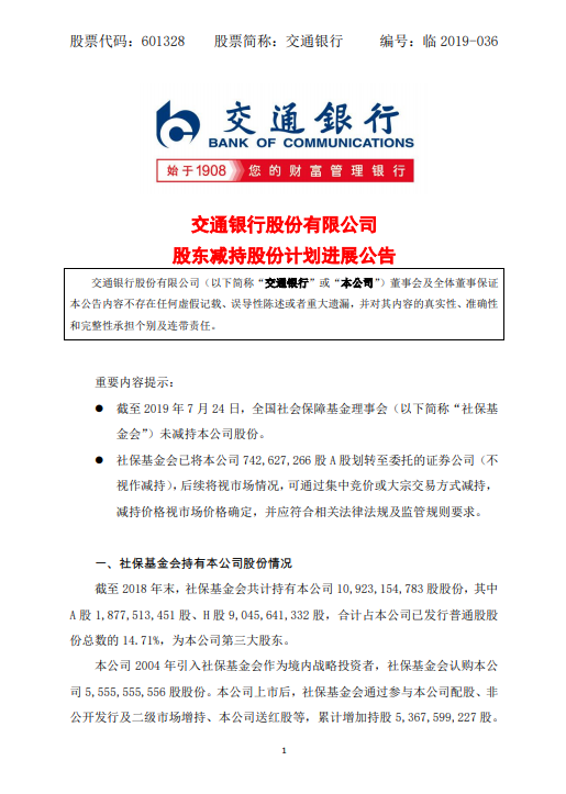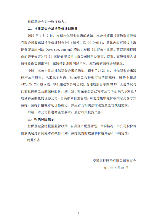 新浪财经讯 7月24日消息,交通银行公告,截至7月24日,社保基金会未减持公司股份。未来三个月内,社保基金会将视市场情况减持,减持不超过7.43亿股A股,即不超过公司总股本的1%。