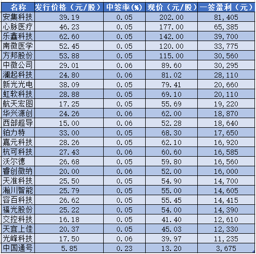 其中,为投资者带来最多收益的是安集科技,中一签能赚8.14万元;最少的是中国通号,中一签能赚3675元。