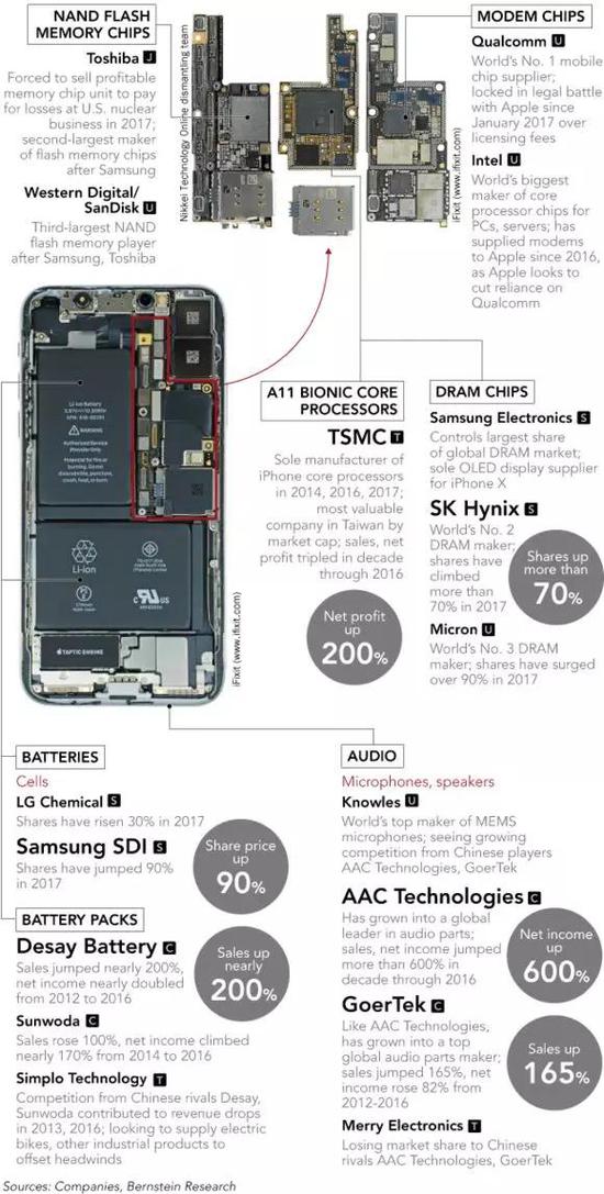 但遗憾的是,除此之外,iPhone 手机内其它核心元器件仍高度依赖外部供货商,包括闪存(东芝、西数)、内存(三星、SK海力士),以及基带芯片(高通、英特尔)。