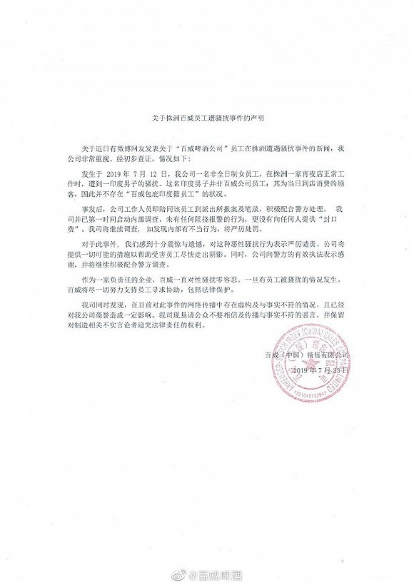 据百威啤酒官方微博发布声明,近日有微博网友发表关于“百威啤酒公司”员工在株洲遭遇骚扰事件的新闻,经初步查证,涉事印度男子并非百威公司员工,而是到店消费的顾客,百威不存在“包庇印度籍员工”的状况。事发后,公司工作人员立即陪同员工到派出所报案及笔录,没有任何阻挠报警的行为,更没有向任何人提供“封口费”。