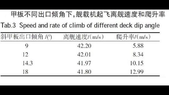 从上表也可以看出,由于滑跃甲板角度增大,使得舰载机离舰速度有所降低,以12°和14.3°倾角为例,速度仅仅是从42.01m/s降低为41.97m/s,速度变化对于起降性能几乎没有任何影响。但是倾角增大使得舰载机离舰后的爬升率从8.34m/s上升到10.15m/s,这样就使得舰载机离舰后的飞行轨迹没有明显的“下坠”现象,可以明显提高安全储备高度界限和舰载机离舰飞行最低安全许可高度。