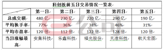科创板上市首5个交易日不设涨跌幅限制。截至第5个交易日收盘,科创板首批25家公司股价较发行价,均实现不同程度上涨,平均涨幅约140%,其中安集科技“夺魁”,较发行价大幅上涨约350%。5个交易日科创板总成交额突破1400亿元。以最新收盘股价计算,25家公司平均市盈率约120倍。换手率方面,5个交易日平均换手率分别约为77%、36%、38%、46%、31%。