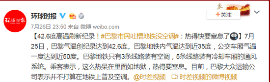 原标题:42.6度高温刷新纪录!#巴黎市民吐槽地铁没空调#:热得快要窒息了
