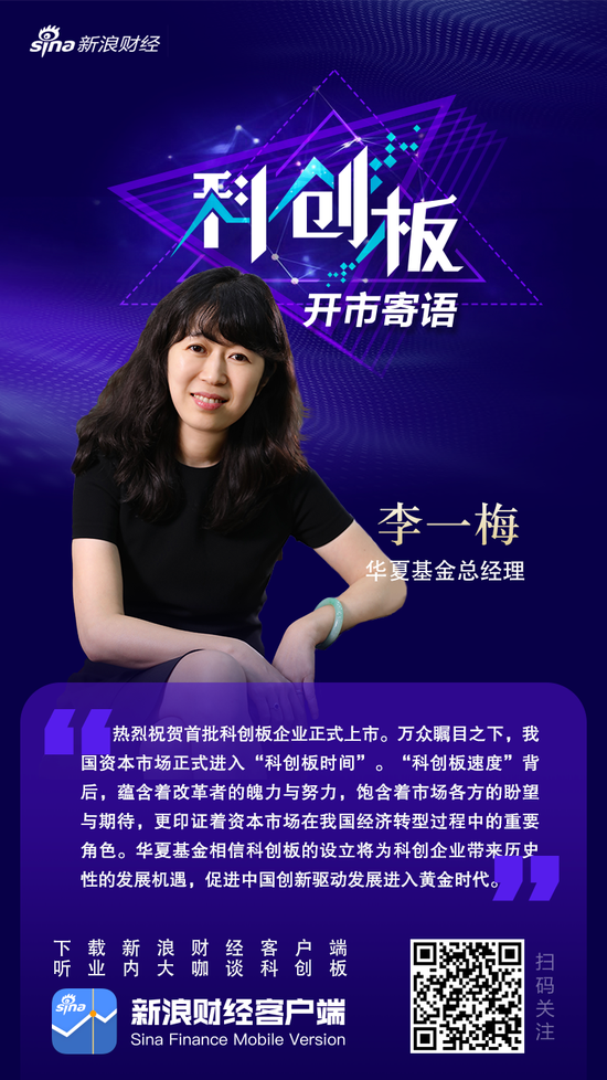 热烈祝贺首批科创板企业正式上市。万众瞩目之下,我国资本市场正式进入“科创板时间”。“科创板速度”背后,蕴含着改革者的魄力与努力,饱含着市场各方的盼望与期待,更印证着资本市场在我国经济转型过程中的重要角色。作为资本市场发展过程中最重要的改革和创新,设立科创板并试点注册制,是深化资本市场改革开放的基础性制度安排,是推进金融供给侧结构性改革,促进科技与资本深度融合,引领经济发展向创新驱动转型的重大突破。我们相信科创板的设立将为科创企业带来历史性的发展机遇,促进中国创新驱动发展进入黄金时代。华夏基金希望发挥专业优势,帮助投资者更好地发现科创板中的“真金”,助力资本市场改革与创新,和其他市场参与者一起,为打造更加规范、透明、开放、有活力、有韧性的资本市场贡献力量。