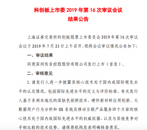 根据此前上交所发布的公告显示,上海证券交易所科创板股票上市委员会定于今天上午9时召开2019年第16次上市委员会审议会议,审议的发行人中就包括传音控股。根据上交所最新公告显示,传音控股正式过会,而这也意味着其成为科创板手机第一股。