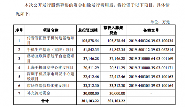 此外,传音控股计划募集30亿元资金。本次公开发行股票募集的资金扣除发行费用后,将投资于以下项目:传音智汇园手机制造基地项目、手机生产基地(重庆)项目、移动互联网系统平台建设项目、上海手机研发中心建设项目、深圳手机及家电研发中心建设项目、市场终端信息化建设项目、补充流动资金。