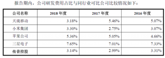 但是,在研发投入上,传音却远远低于三星苹果等公司。数据显示,2016年到2018年,传音控股研发费用率分别为3.31%、2.99%、3.14%,只能说是表现很一般。相比较下,传音却在营销上投入很多,2016年到2018年销售费用分别为9.3亿元、19.5亿元和22.5亿元,占营业收入的比例为8.02%、9.7%和9.95%。