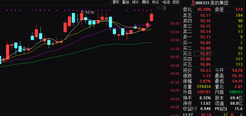 4月29日至7月30日上午收盘,美的集团股价区间上涨约14.62%。今日上午,美的集团上涨2.07%,午间收盘55.13元/股,总市值3825亿元。