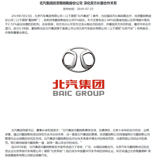 北汽集团宣布,为加强双方长期战略合作,投资戴姆勒股份公司,目前持有戴姆勒股份公司5%股份。本次交易包含2.48%的直接持股以及获得额外等同于2.52%股份投票权的权利。自2013年起,戴姆勒也在北汽集团旗下香港上市公司北京汽车持有股份,并拥有董事会席位。