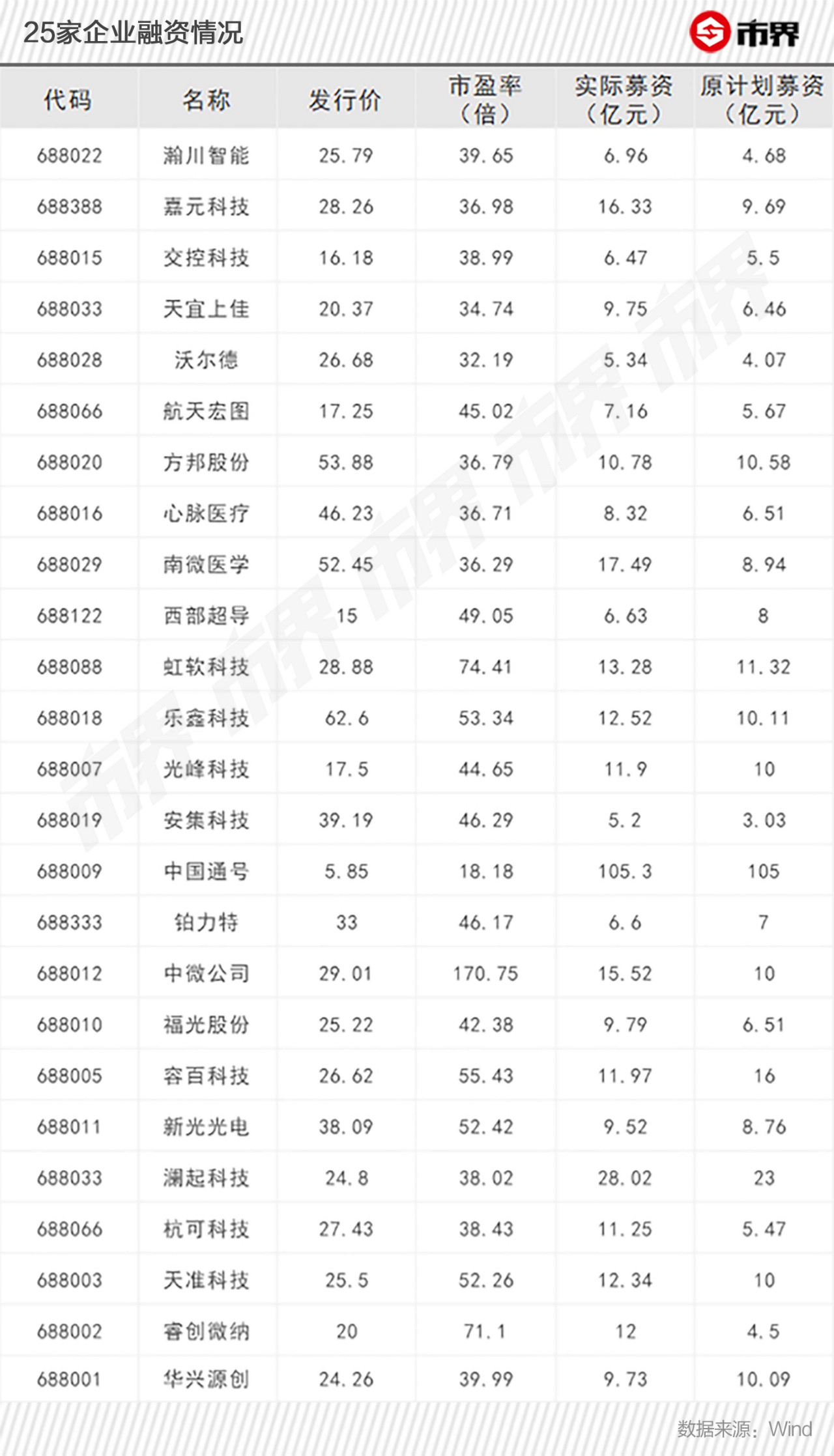 科创板就是为科技企业提供弹药的!从25家科创企业融资情况来看,大多数企业实际募资比原计划募资规模要大,25家企业原计划募资310.89亿,实际融资370.17亿,多融资59.28亿;而且发行市盈率也远远超过22倍市盈率,中微公司发行市盈率达170;这才是科技企业需要的实实在在的支撑。