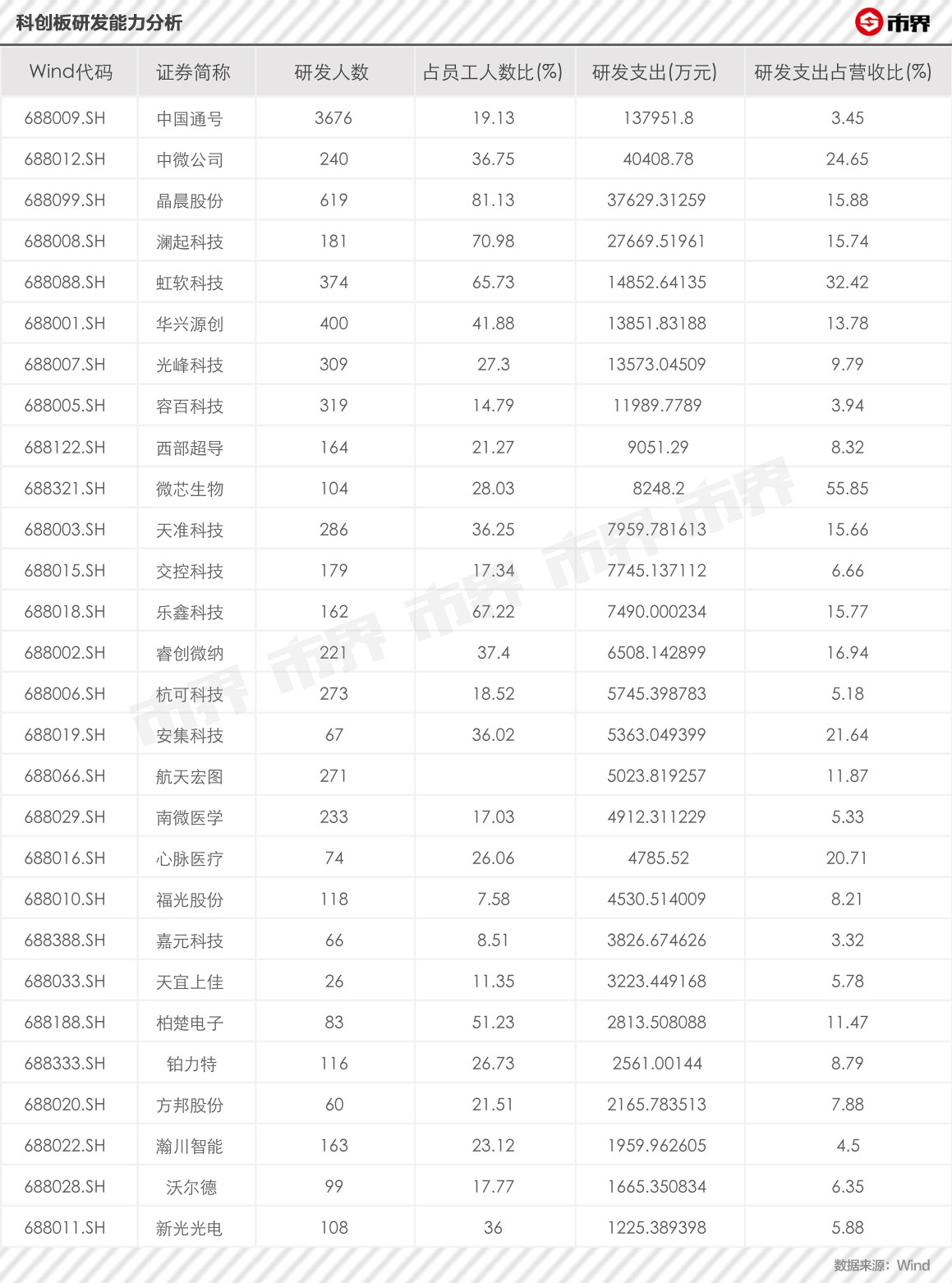 再看看,科创板25家企业的研发能力,研发人数方面,中国通号的研发人员最多,有3676人;而研发人员占员工比方面,分别有晶展股份、澜起科技、虹软科技、乐鑫科技以及柏楚电子等5家公司科研人员占员工比达50%以上。研发投入上,中国通号的研发投入有13.8亿,微芯生物研发投入占营收比达55%。总之,科创板的上市企业一定是要有超强的科技研发。