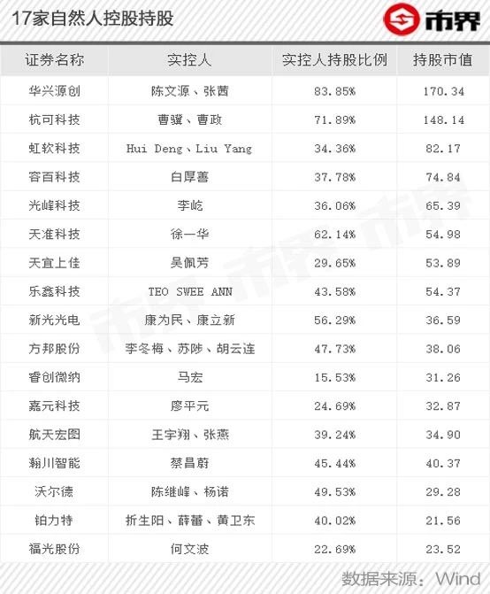 25家科创板企业中,有17家是自然人控股,占比70%,从17家自然人控股股东持股情况基本可以发现,在没有巨无霸市值的情况下,科创板首富大概率就会在华兴源创和杭可科技中产生。再看两家公司周五收盘市值,两者都在200亿左右,差就差在实控人持股比例上。