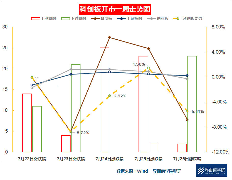 从整体走势上看,界面商学院对25只科创板个股日行情通过总市值加权形成对科创板走势的参考,并与上证指数与创业板指对比绘制上图(首日波动较大未纳入)。图中,黄色虚线反映了科创板的整体走势,即科创板的累计涨跌幅,棕色线反映的是科创板的单日涨跌情况,即科创板的单日涨跌幅。柱形图为各日公司涨跌数量。