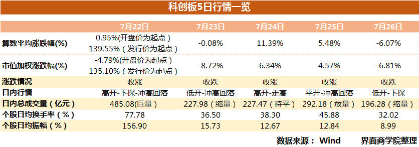 截至7月26日收盘,科创板25家上市公司总市值达到5,095.88亿元,流通总市值达到657.19亿元。个股相较于发行价平均涨幅为140.20%,其中涨幅最大的是安集科技(688019.SH),5日内涨幅349.73%。成交额最大的个股为中国通号(688009.SH),5日内累计成交232.18亿元。换手率最高的个股为沃尔德(688028.SH),5日内换手率305.77%。