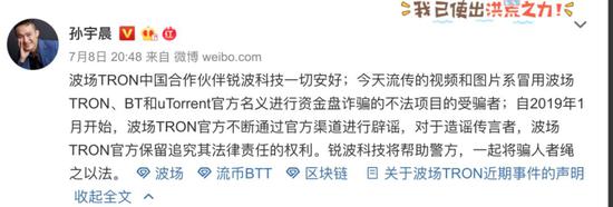 直到今年7月1日出事后,孙宇晨才在微博辟谣称请大家“警惕资金传销盘”。