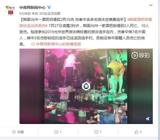 [韩国光州一酒吧坍塌致2死10伤 伤者中含多名游泳世锦赛选手]#韩国酒吧坍塌游泳运动员受伤# 7月27日凌晨2时许,韩国光州一家酒吧倒塌致2人死亡、10人受伤。包括参加2019光州世界游泳锦标赛的游泳选手在内,伤者中有7名外国人,其中3名伤势较轻的选手已经返回选手村。目前没有中国籍人员伤亡的消息。