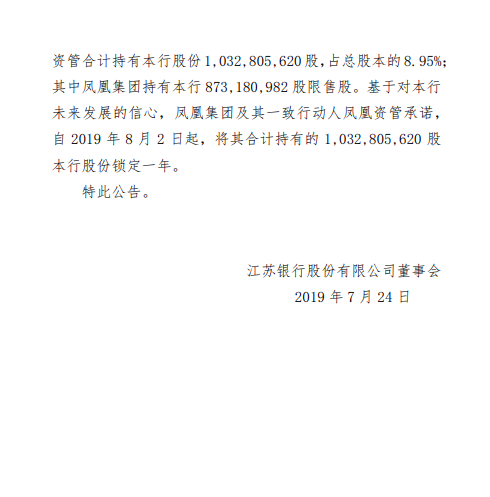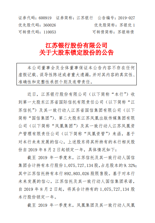 新浪财经讯 7月23日,江苏银行发布公告称,该行于近日收到第一大股东江苏省国际信托有限责任公司(下称江苏信托)及其一致行动人江苏省国信集团有限公司(下称国信集团)、第二大股东江苏凤凰出版传媒集团有限公司(下称凤凰集团)及其一致行动人江苏凤凰资产管理有限责任公司(下称凤凰资管)来函,基于对该行未来发展的信心,上述股东将其所持有的江苏银行相关股份自2019年8月2日起锁定一年。