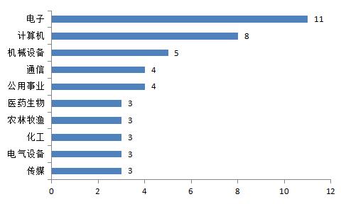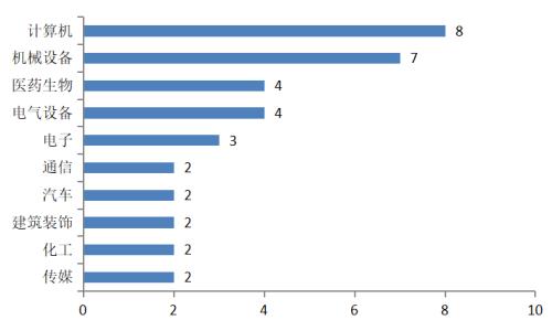 以所属申万行业分类统计,毕业于清华大学的董事长主要分布在电子、计算机和机械设备行业,分别有11、8、5位,这或许得益于清华大学强大的理工科教学实力(图9)。