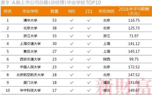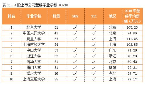 从A股上市公司看,董事长毕业学校前三强为清华、北大和浙大;总裁主要来自985院校的管理类专业,毕业于人大的平均薪酬最高,为172.5万元;财务总监主要来自于财经类院校的会计专业,毕业于上财的人数最多,毕业于央财的平均薪酬最高;北大和人大的董秘数量最多,且近一半为80后,他们多出自金融学专业,拥有丰富的金融机构工作经验。