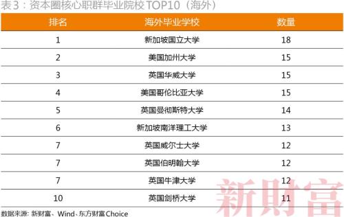 资本圈海归们就读的高校相对较分散,留学的国家也比较多。其中,就读人数前十名的海外院校分布在新加坡、美国和英国,包括新加坡国立大学、美国加州大学、英国华威大学、美国哥伦比亚大学、英国曼彻斯特大学、新加坡南洋理工大学、英国威尔士大学、英国伯明翰大学、英国牛津大学、英国剑桥大学(表3)。新国立以18人的数量,位居第一。