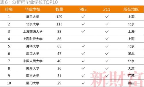 新财富对1157位分析师的数据统计发现,复旦大学力压一众名校,成为最盛产分析师的大学,有129位分析师毕业于复旦,占样本分析师的比例达11.1%;北京大学排名第二,有113位分析师毕业于北京大学,占比约为10%。复旦大学、北京大学被称为券商分析师的“摇篮”也言不为过了。