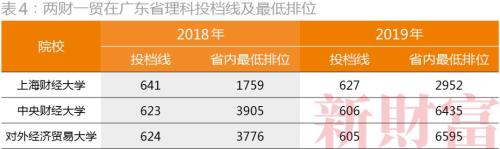 然而值得注意的是,今年包括上财、中央财经大学、对外经济贸易大学在内的“两财一贸”,在不少省市的录取分数线“跳水”明显。一直以来,财经类高校和专业都备受追捧,“两财一贸”的录取分数线甚至超过众多985高校。不过,从今年广东省本科招生看,财经名校的热度已有所下降。以理科为例,上财今年的投档线是627分,对应的排位同比下滑1000多名;央财的录取最低排位降了2500多名;外经贸大学降了2800多名;西南财经大学的最低排位下降4000多名(表4)。财经名校的降温,除了“双一流”综合类高校的吸引力加强,是否也意味着金融业的引力下降?这会否影响金融业的转型?值得关注。