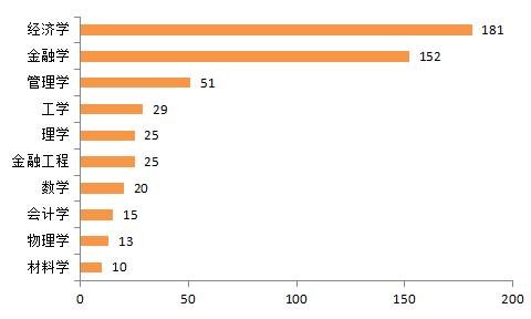 来自名校的分析师们,主要学习的是何种专业呢?新财富统计发现,和基金经理一样,经济学和金融学专业依然最多,分别有181和152位分析师学习这两个专业,达到一半的比例。此外,管理学毕业的分析师数量也较多,为51人。另外,学习工学、理学、金融工程、数学、会计学、物理学和材料学专业的分析师也占有一定比例(图7)。