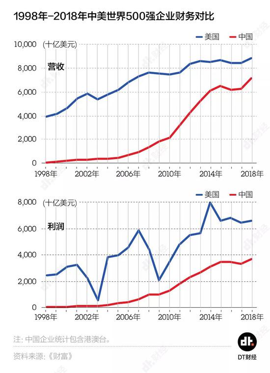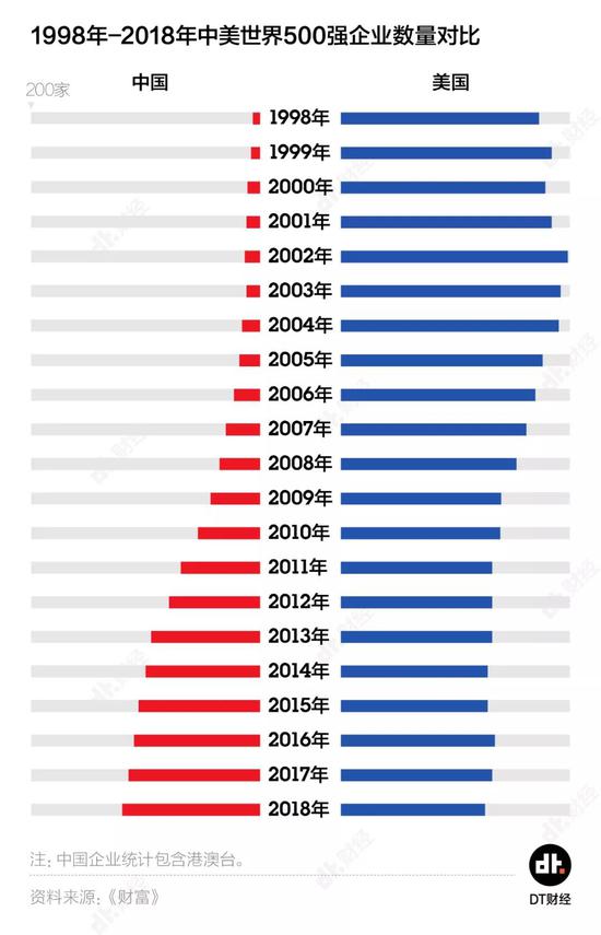DT君梳理了1998年至2018年《财富》500强的所有数据,描绘出了中国与美国企业20年的变迁。