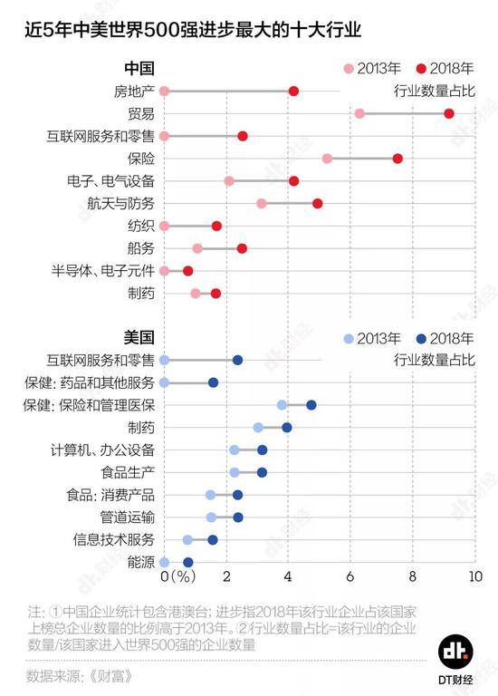 我们盘点了中国与美国5年内进步最快的十大行业(进步指2018年行业占比高于2013年),发现中国进步最大的行业非房地产莫属,增幅高达4.17%,十分的中国特色。即便国家在2018年实施了宏观调控,在最新的2019年榜单中,房地产企业仍旧进步显著,5家房地产公司排名均有大幅提升,其中排名上升最快的企业为碧桂园,跃升176位。