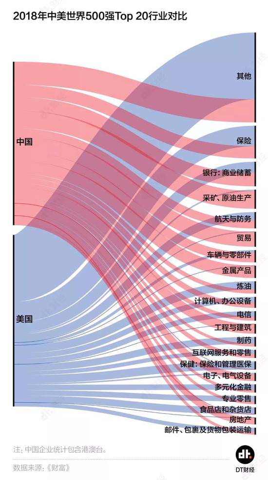 再看国家队的构成,中国的500强企业只覆盖了35个行业,而美国队有来自72个不同领域的企业选手,多样性和均衡性上又甩开鄙队一个档次。