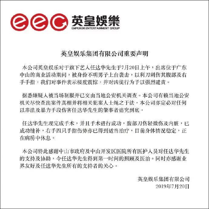 当天,任达华所属的英皇娱乐集团有限公司发布声明称强烈震惊,“对凶徒的行为的予以强烈谴责”,会追究到底。