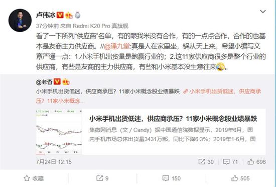 随后卢伟冰也表态,称“看了一下所列“供应商”名单,有的跟小米没有合作,有的(只有)一点点合作,合作的也基本是友商主力供应商”。