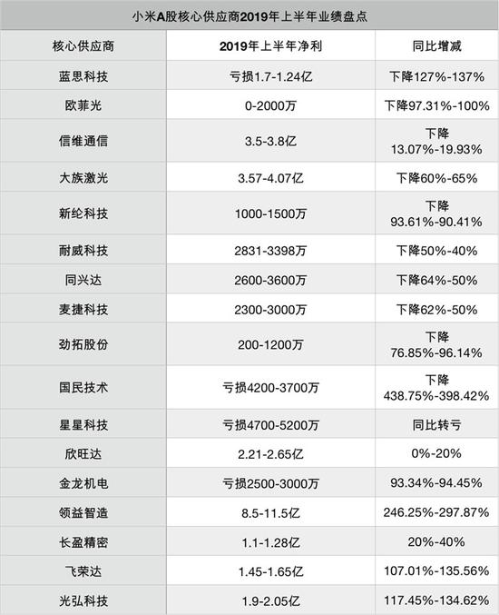 文中指出,“今年3月,小米9多次缺货的风波将小米集团和雷军推至风口浪尖。业界多数观点认为,供应链问题成为小米手机缺货的罪魁祸首”,并附上小米A股核心供应商2019年上半年业绩盘点,18家供应商中有11家业绩同比下降。