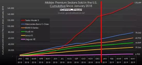 从2018年1月起美国豪华中型轿车累计销量统计图可以一窥端倪。在2018年12月,Model 3的累计销量增长曲线出现了一个拐点,而奔驰C级、宝马3系、奥迪A4、雷克萨斯IS和捷豹XE没有出现明显的拐点。