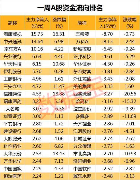 3股主力资金净流出逾5亿元,五粮液主力资金净流出规模8.7亿元居首,该股本周累计下跌0.73%;万科A本周主力资金净流出8.13亿元,股价本周累计下跌2.44%;新城控股主力资金净流出6.45亿元,本周股价下跌9.24%。主力资金净流出较大的还有正邦科技、华林证券、东方财富、浙江龙盛、美的集团等。