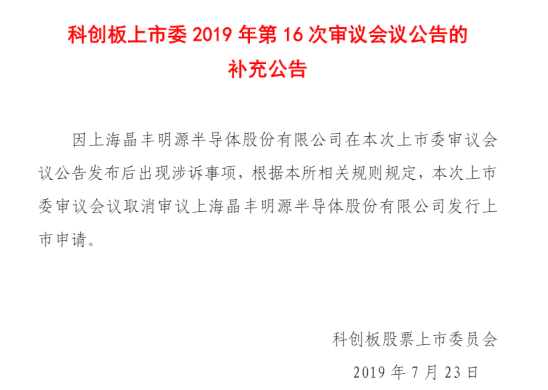 新浪财经讯 7月23日消息,上交所发布公告,因晶丰明源在本次上市委审议会议公告发布后出现涉诉事项,根据相关规定,本次上市委审议会议取消审议其发行上市申请。