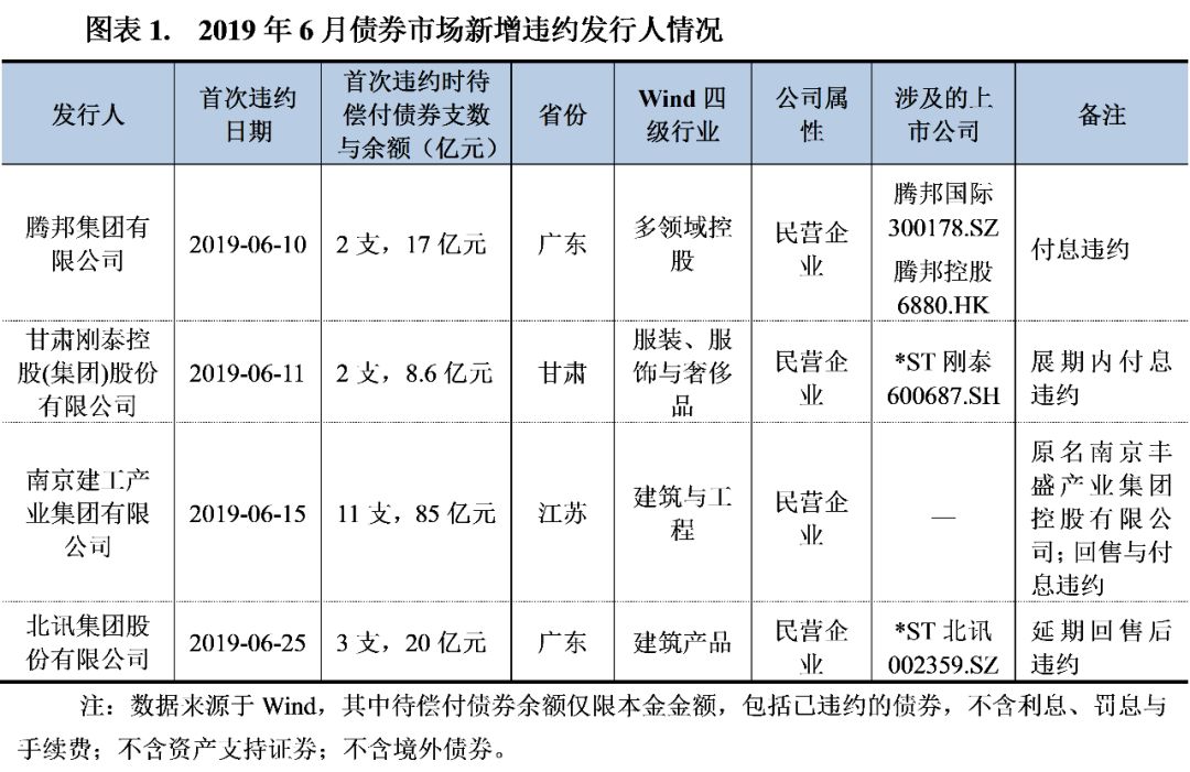 2019年6月债券市场共有4家新增违约发行人,分别为腾邦集团、刚泰控股、北讯集团与南京建工,上述发行人违约时待偿付债券共18支,本金余额共130.6亿元。除债券违约事件外,2019年6月齐成石化借款逾期,存续债券提前偿还;凤凰机场中期票据启动递延付息条款;宏氏投资可交换债“16宏氏E2”延期赎回。