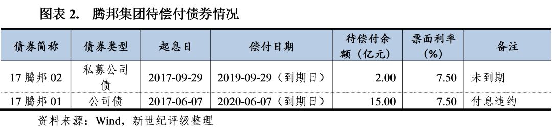 6月10日,腾邦集团有限公司(简称“腾邦集团”)公司债券“17腾邦01”付息违约,违约利息金额1.125亿元。包括已违约债券在内,腾邦集团待偿付债券共2支,本金余额共17亿元。