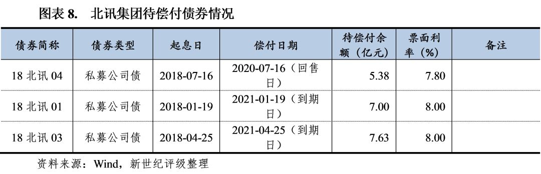 6月25日,北讯集团股份有限公司(简称“北讯集团”)未能偿付私募公司债券“18北讯03”利息资金,构成违约。此前,公司另外1支私募公司债券“18北讯01”在与债券持有人达成一致之后,延期至2019年10月21日付息。包括以上2支债券在内,北讯集团待偿付债券共3支,待偿付本金余额共20亿元。