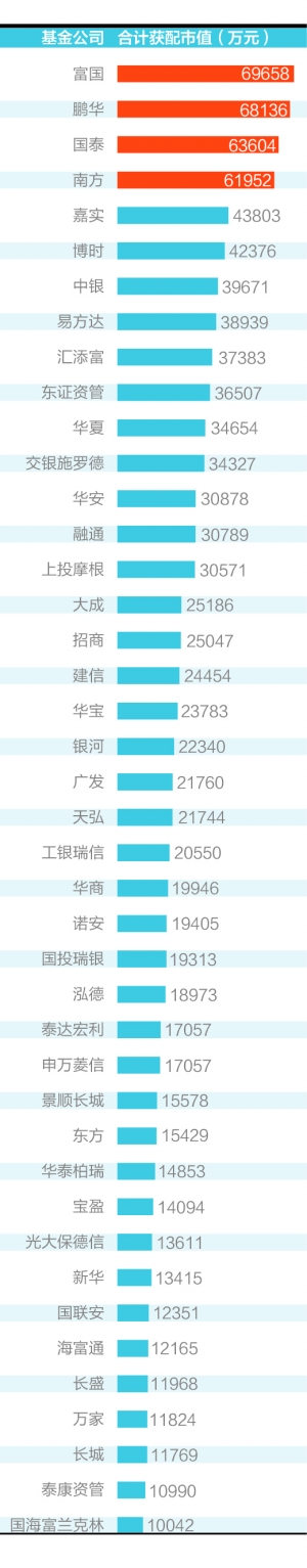 从单只基金来看,共有约1600只产品获得配售,其中3只产品全部“打中”,分别为国联安鑫隆、国联安德盛小盘精选和国联安德盛精选。从获配市值来看,有55只产品获配金额超过1800万元,泰康资产、融通、大成等基金公司旗下基金获配金额较高。
