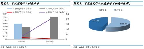 我国可交换债的发行情况。目前我国可交债市场共发行个券 246只,合计发行规模 3,213.09 亿元,存量方面,可交债市场存量规模 2,345 亿元,存量 只数 148 只,由于私募发行灵活性更高,可交债市场仍以私募 EB 为主,公 募 EB 的表现则较为平淡。发行人性质方面,从发行只数上看,民企居多, 国企偏少。从发行规模上看,国企高于民企;从发行规模的分布来看,私募 EB 小盘居多,公募 EB 的发行规模要高于私募 EB;从发行利率来看,公募 EB 要明显低于私募 EB,公募 EB 的发行利率在 0.5%~1.8%之间,而私募 EB 的票息多在 2%~10%之间。