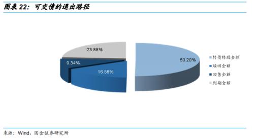 目前已退市的可交债共96只[13],发行总额763.80亿元,其中转股金额367.38亿元,占比50.20%,赎回金额121.32亿元,占比16.58%,回售金额68.38元,占比9.34%,到期金额174.79亿元,占比23.88%。