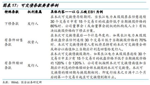 值得说明的是,有两只私募EB不仅设置了下修条款还设置了上修条款,分别是17国轩E2和17国轩E4,上修条款的设定类型为30/15,120%,即在换股期前,当标的股票在任意连续30个交易日中有15个交易日的收盘价高于当期换股价格的120%时,公司执行董事(或执行董事授权人士)有权决定换股价格是否向上修正。另外还有三只私募EB并没有设定具体的触发条件,而是由公司股东会授权公司执行董事根据市场和公司具体情况与承销商协商确定。