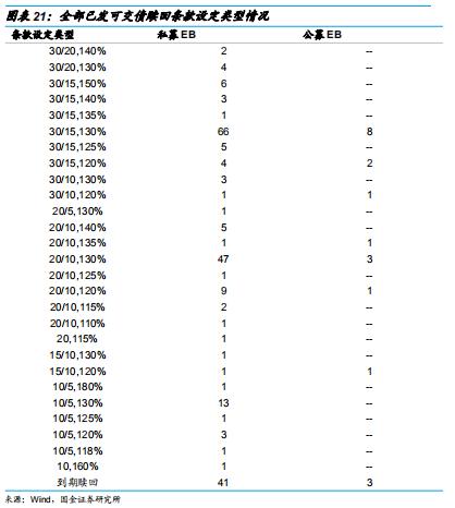 有条件赎回条款的设定类型比较多,有27种,其中最主流的设置是30/15,130%和20/10,130%这两种,即在换股期内,当标的股票在任意连续30交易日中至少15个交易日的收盘价不低于当期换股价格的130%时/20交易日中至少10个交易日的收盘价不低于当期换股价格的130%时,发行人董事会有权在约定的交易日内决定是否按照面值或面值一定比例向投资者赎回债券。公募EB最喜欢设定的类型是30/15,130%;私募EB最喜欢设定的类型是30/15,130%和20/10,130%。
